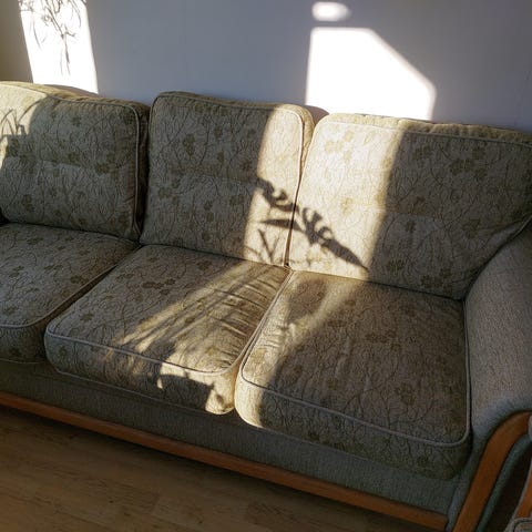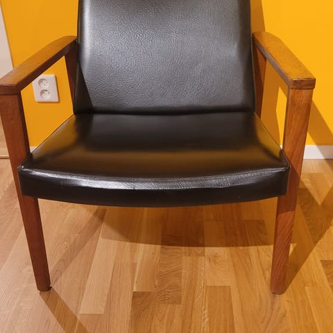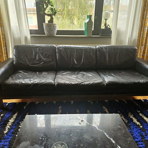 Svensk, SOFFA, Futura, Tibro, omkring 3-sits soffa med lösa sittdynor häftad rygg, konstskinn, underrede i teak.