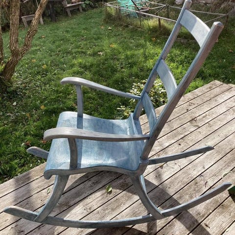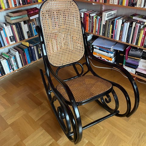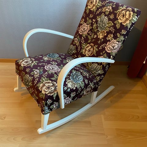 Säljer nu vår fina gungstol i inköpt på auktion. Osäker på vem som designat den men den flirtar absolut med Ton-stolar av olika slag.
