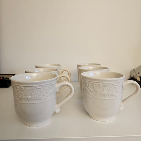 6 st Schönwald 9485 kaffekoppar med tillhörande fat i vitt porslin. Setet innehåller sex koppar och sex fat. Kopparna har en klassisk design med öra och passar för servering av kaffe.