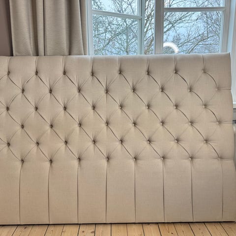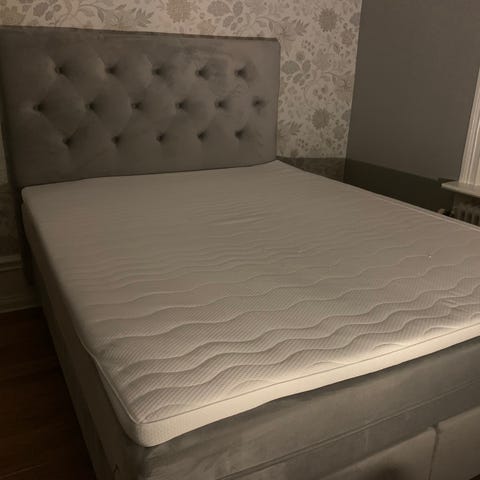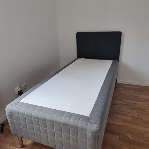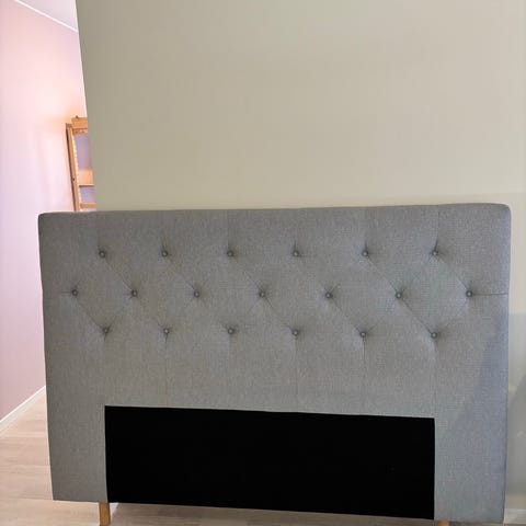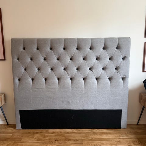 Ljusgrå sänggavel och kista till 180–säng i nyskick.