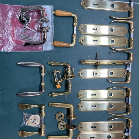 Set med 4 handtag och 8 knoppar i mässing som suttit på serveringsskåp i sekelskiftesbostad.