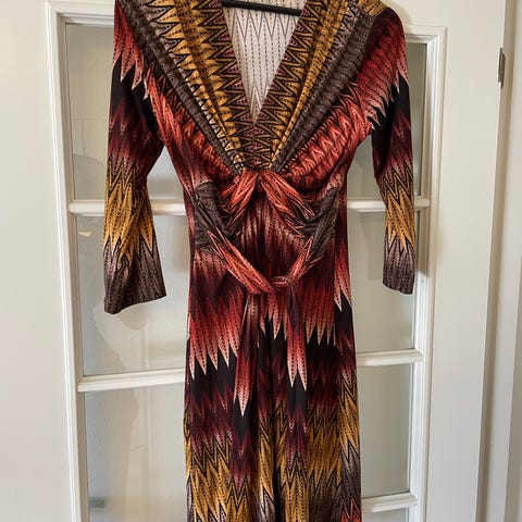 Lång väldigt söt blommig klänning. Har lång urringning. Dragkedja bak. Storlek L, 60 kr