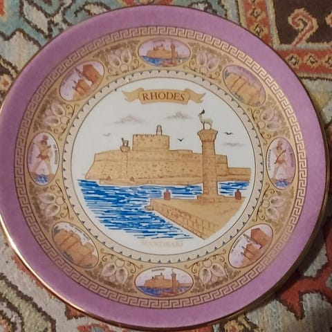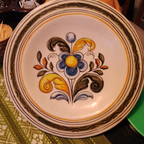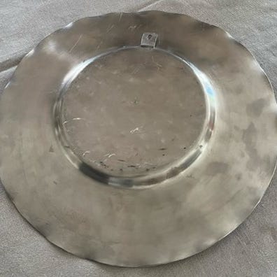 Dekorativ metalltallrik med detaljerade hästmotiv i relief. Tallriken har en cirkulär form och är prydd med ornament längs kanten. Passar som väggdekoration eller samlarobjekt.