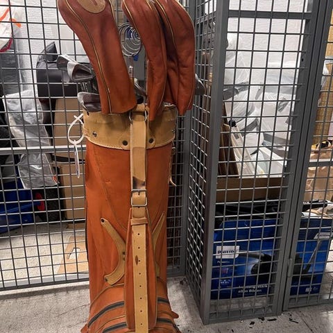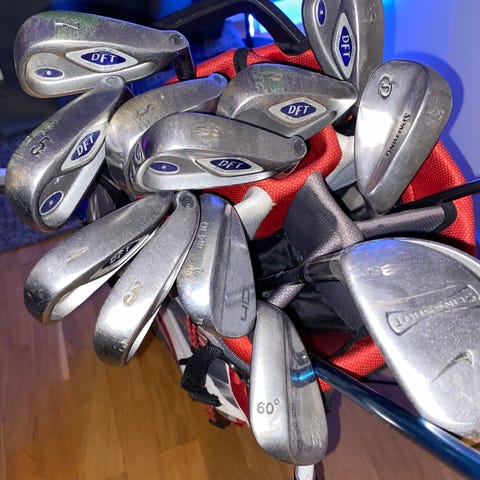 Adidasbag med många bollar, peggar, paraply, vanligt skydd/regnskydd samg headcovers till Drivers