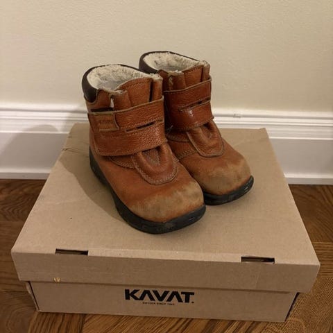 Kavat barnskor: skor till höger strl 24, skor till vänster strl 25. Skorna är tillverkade i slitstarkt material och designade för att passa barn. De har en robust sula och en bekväm passform för små fötter. Använda men användbara i högsta grad pga Kavats kvalitet.