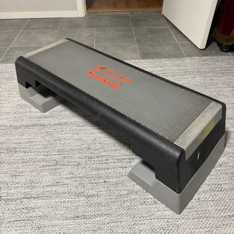 Reebok steppbräda med halkfri yta för stabilitet under träning. Steppbrädan är utformad för att användas vid olika träningsövningar och är tillverkad i slitstarkt material. Den har en svart plattform med Reebok-logotyp och röda stödben som kan justeras för att ändra höjd.