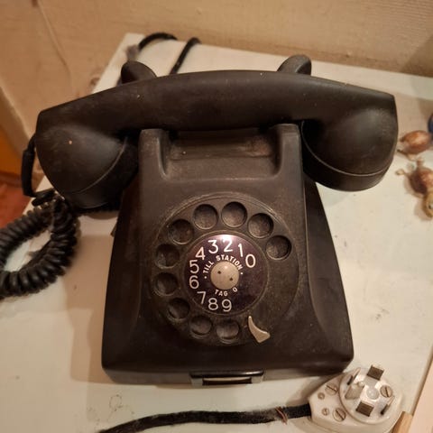 Retro telefon med sladd och snurrskiva. Fungerade senast vi använde telefonen. För ett år sedan.