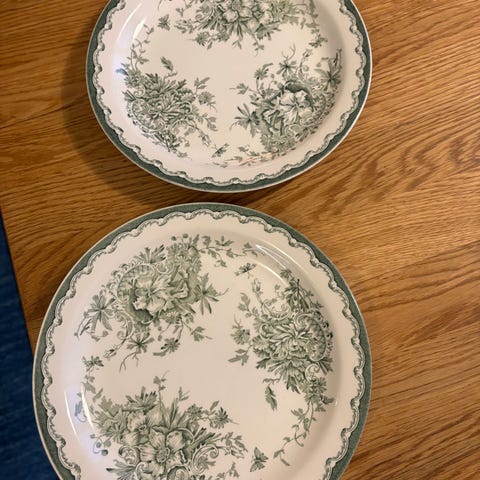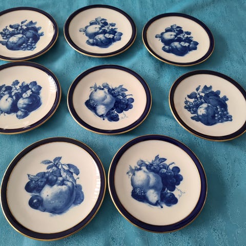 Rörstrand jubileumsserien tallrikar, 4 stycken, med en diameter på cirka 19 cm. Tallrikarna har ett blommönster i blått och grönt på vit bakgrund. Tillverkade i porslin.