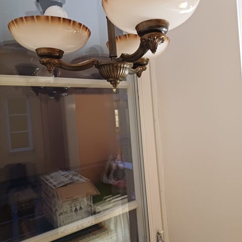Superfin taklampa i gjutjärn. Troligt art deco, jugend. Den hängs med en krok och har kedja ifall att man har kontakten längre bort, går att minska eller förlänga kedjan. Lampan är trearmad och jag har inte kollat elen på den, det behöver köpare göra. Det går att ha stearinljus i den för att göra ett rum mer romantiskt. Lampan är i metall / gjutjärn.