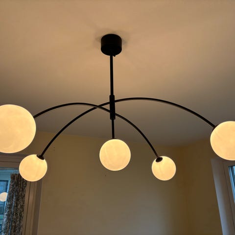 Säljer en stilren taklampa i svart metall, från Markslöjd (modell Capital). Lampan har flera armar med stora dekorativa globlampor som ger ett varmt och snyggt ljus – perfekt över matbord eller i vardagsrum.