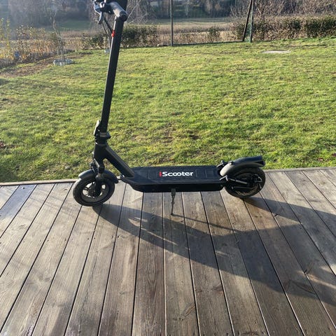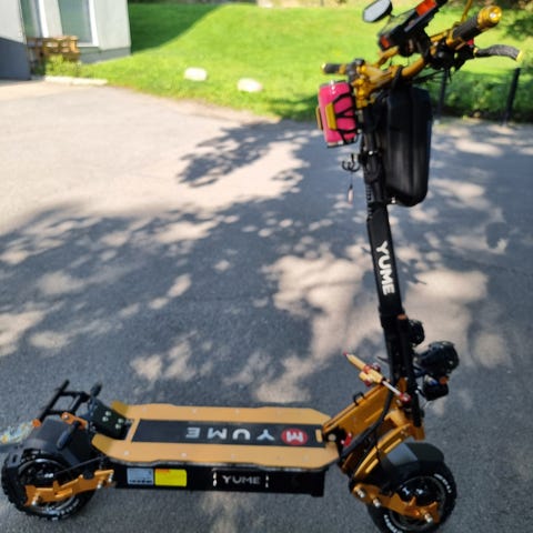 Inmotion elscooter i svart färg. Utrustad med hjul och styre för personlig transport. Helt ny , upp packad ur kartongen enbart. Gör 55-60 km men kan ställas in på appen till 25 km i timmen med.