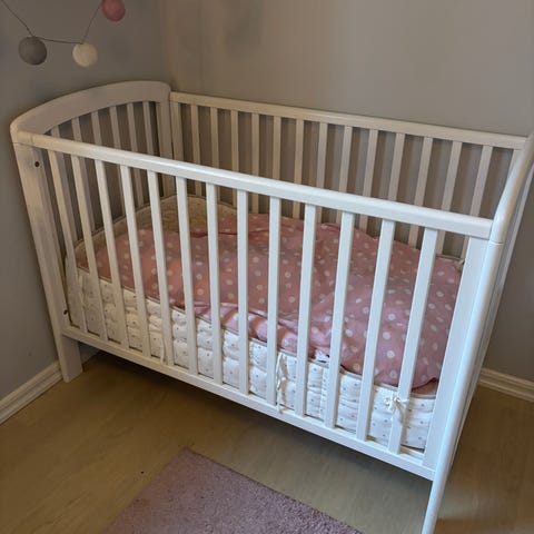 Madrassmått 60x120cm, madrass och spjälskydd medföljer. Justerbar i nivåerna 20, 36 och 52 cm. I fint använt skick.