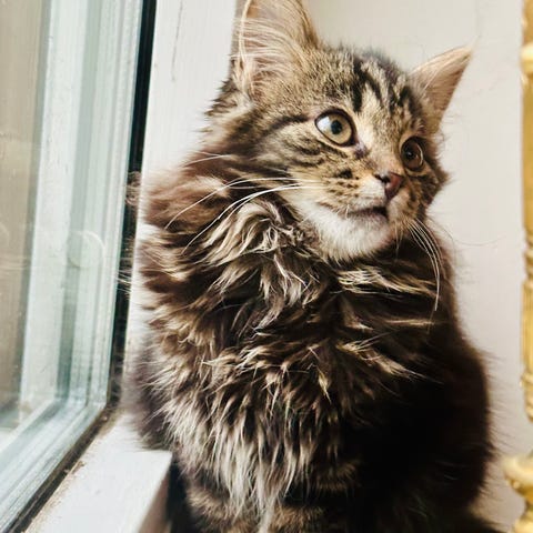 Totoro: Hona, Blåskköldpadd-golden-tabby. Mycket tillgiven, uppmärksam, uppsökande, social, gosig, näpen och avspänd, gillar höjder och att klättra uppåt.