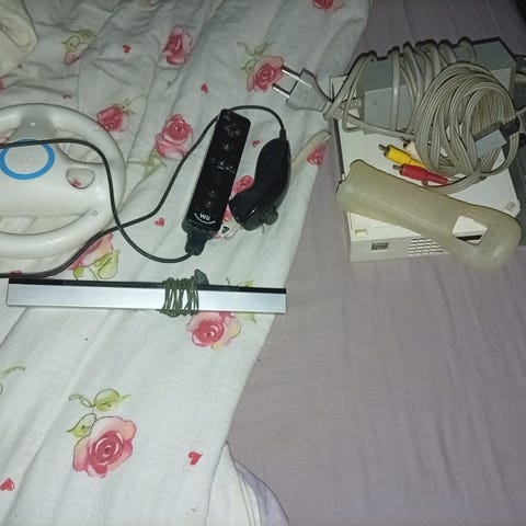 Nintendo Wii med samtliga delar som vi säljer. Den stora vita plattan använder vi framförallt till snowboardspelet.