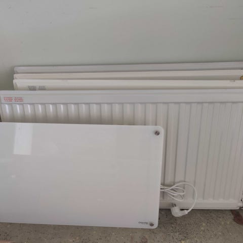 Tio stycken vita radiatorer av standardmodell. Används för uppvärmning i bostäder eller andra utrymmen.