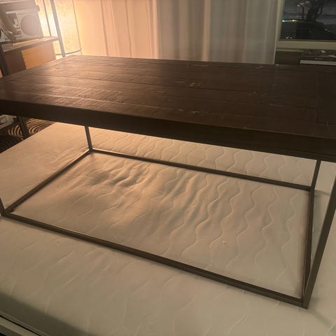 Mörkt trä (sannolikt Sheesham, Indian rosewood) med metallbeslag (wrought iron style).