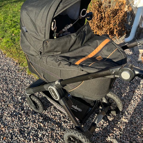 Emmaljunga barnvagn i grå färg. Barnvagnen har en robust konstruktion med tre hjul och justerbart handtag. Den inkluderar en mjuk sittdel och ett avtagbart klädselöverdrag. Passar för barn och är utformad för daglig användning.