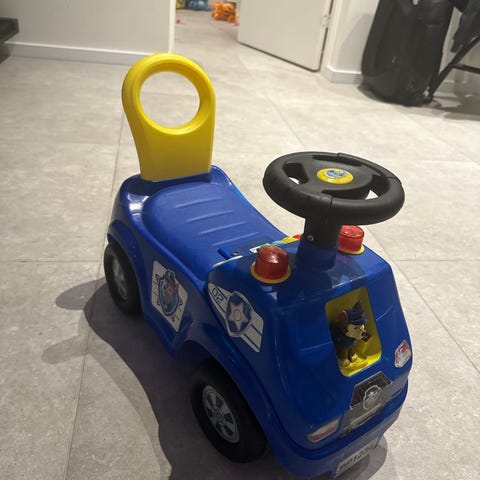 Paw Patrol leksaksbil med flera hjul och en röd, blå och vit färgkombination. Fordonet har en öppningsbar baklucka och är tillverkat i plast. När man trycker på den blå knappen på toppen åker bilen framåt. Kräver 6 st AA-batterier.
