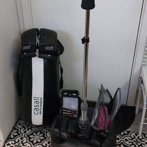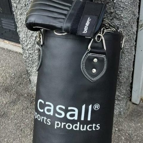 Boxningssäck i blått med texten "adrenalin". Ett par boxningshandskar av märket Casall i storlek M ingår Boxningshandskar i svart färg. Handskarna är designade för träning och skydd vid boxning.