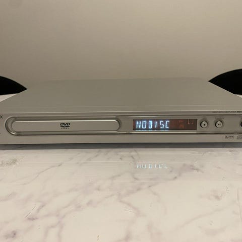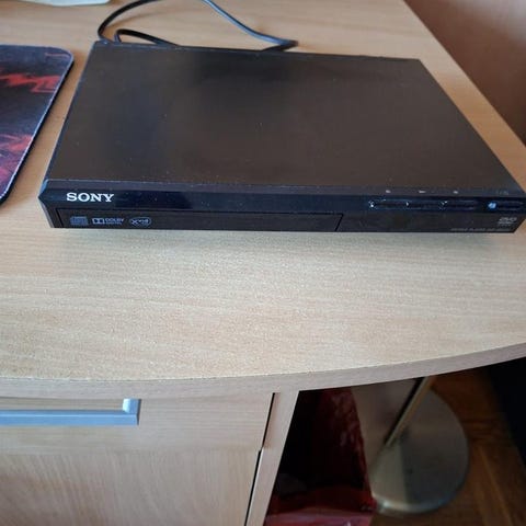 Sony DVD-spelare inklusive fjärrkontroll. Enheten har anslutningar för ljud och video på baksidan och är avsedd för uppspelning av DVD-skivor.