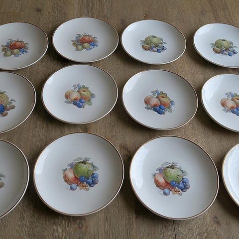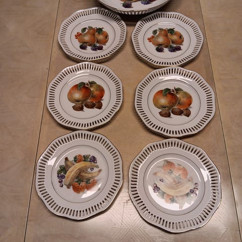 Glastallrikar från 70-talet. 8 st stora, 8 st assietter och 2 st små.