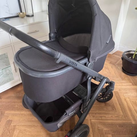 Nytt chassi i kartong medföljer, samt regnskydd och myggnät.