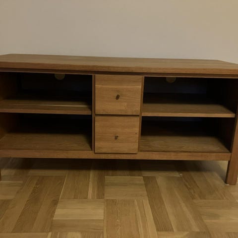 Mio TV-bänk i trä med flera förvaringsutrymmen inklusive hyllor och skåp med dörrar. Möbeln har en naturlig träfärg och passar för vardagsrum eller liknande utrymmen.