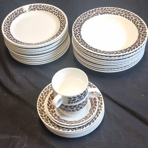 Säljer min finare servis från klassiska Gustavsberg. Bronsliknade bladornament. Stilrena och tallrikar är nätta i sin design, porslinet ej kraftigt.