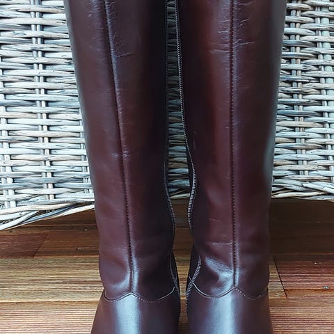 Svarta stövlar i storlek 6½ (40). Höjd 42 cm, vadomkrets 33 cm. Stövlarna är blanka med en slät yta och har detaljer i form av spännen vid hälen. Sulorna är mönstrade för bättre grepp.