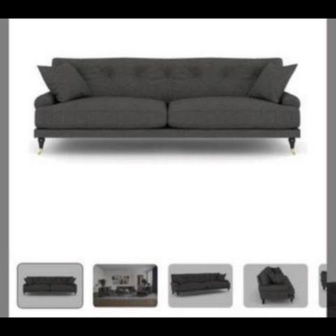 Jysk soffa i grått tyg. Soffan har tre sittdynor och tre ryggkuddar samt träben. Passar för vardagsrum och andra sittutrymmen.