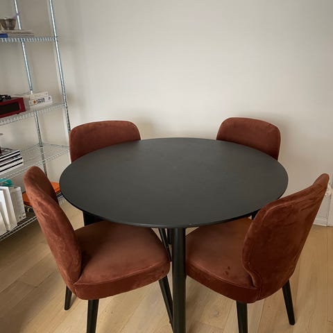 Litet och smidigt runt matbord. Målad laminatskiva i grön färg vars ncs jag fått från Svenskt tenn. Några skavda fläckar så behövs en ommålning. Underrede i svart metall.