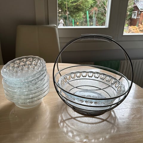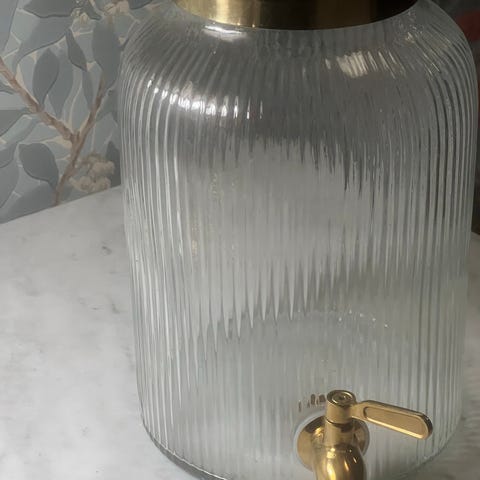 IKEA glasbehållare med kran, tillverkad i glas med ett mönstrat yttre. Behållaren är avsedd för att förvara och servera drycker.