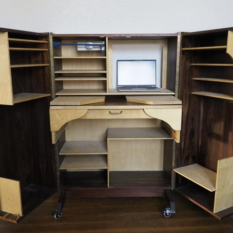 Skrivbord med uppsats, 1800/1900-tal. Löstagbar hylla och skåp. Nyckel finns till skåp och lådor. Bruksskick. Skav och märken förekommer, se bild. Bordsyta 62.5 x 96. Höjd 77-147.