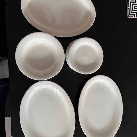 8 tallrikar, 6 djupa mattallrikar, 8 assietter, 6 st skålar, 6st småskålar, 3 mindre skålar, 4 äggkoppar, ett ovalt uppläggningsfat, 4 st kaffekoppar. Det mesta är mycket bra skick, en liten svart skål har ett märke.