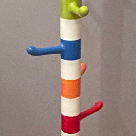 IKEA barnklädhängare med flera krokar i olika färger. Passar för barnrum och är utformad för att hänga kläder och accessoarer på ett organiserat sätt.