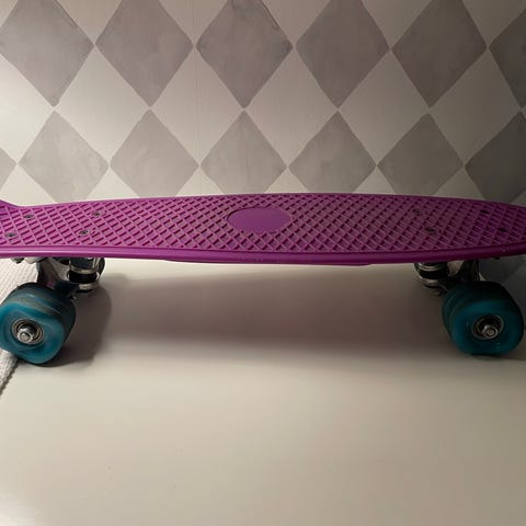 Sweet skateboard med en undersida som har ett färgglatt mönster och en svart ovansida med en tecknad figur som bär solglasögon. Passar för allmän skateboarding.