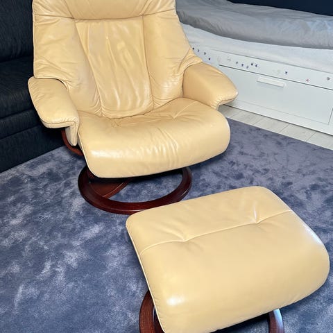 Bekväm loungefåtölj med fotpall i klassisk design. Stolen har formpressat trä, ljus läderklädsel och den ikoniska silhuetten som passar perfekt i vardagsrum, kontor eller lyxigt läshörn.