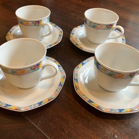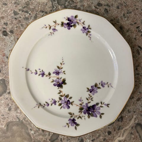 Underbar design med lila violer, gröna blad och guldtrim – en riktig klassiker! Allt i fint skick, mindre bruksslitage. Perfekt för samlare, afternoon tea eller som unik dukning!