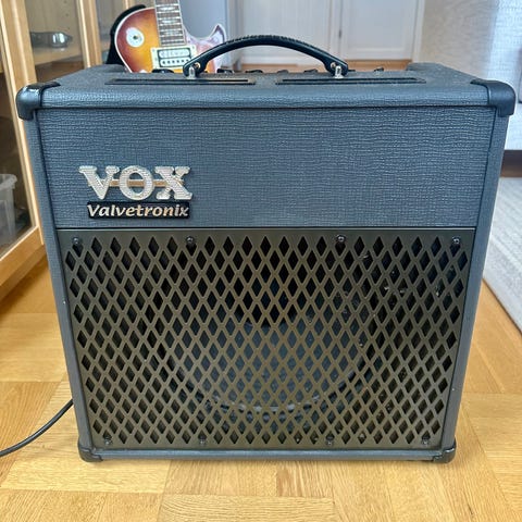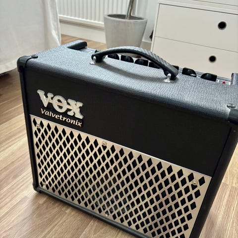 Vox Valvetronix gitarrförstärkare med två 12 tum högtalare. Svart färg och robust konstruktion. Förstärkaren har flera reglage och ingångar för anpassning av ljudet, två kanals.