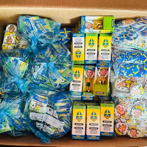 En påse med 14 st vintage ”Smiley Buddies” glas spelkulor (17mm), gul bas med ett glatt ansikte. Från 2003, finns inte längre samlarobjekt.