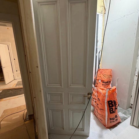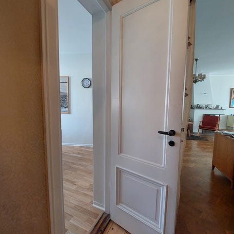 Mycket vacker innerdörr i trä, vitmålad med dekorativa paneler. Suttit i en lägenhet från 1907. Passar för inomhusbruk och kan användas i olika rum i bostäder.