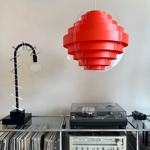 Vintage space-age ufo klotlampor rödorange plast och glas