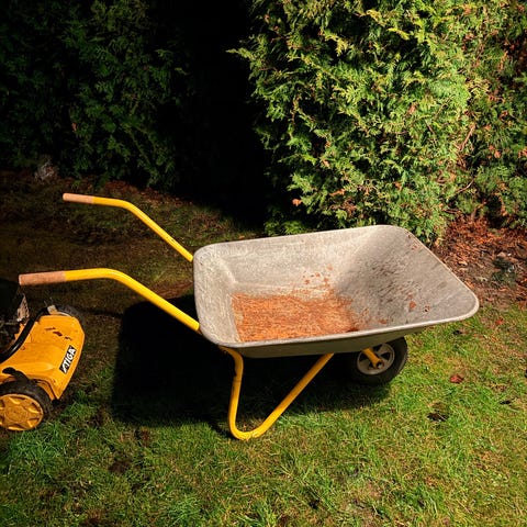 Grön skottkärra med svarta hjul, lämplig för trädgårdsarbete och transport av material. Har handtag för enkel manövrering och två hjul för stabilitet.
