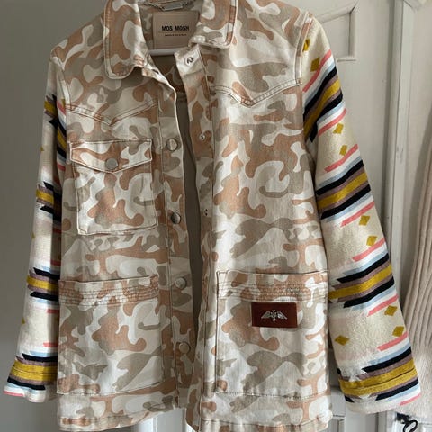 Mos Mosh dunkappa i storlek S för dam. Jackan är brun och tillverkad av dunmaterial, och akryl avsedd som ytterplagg.