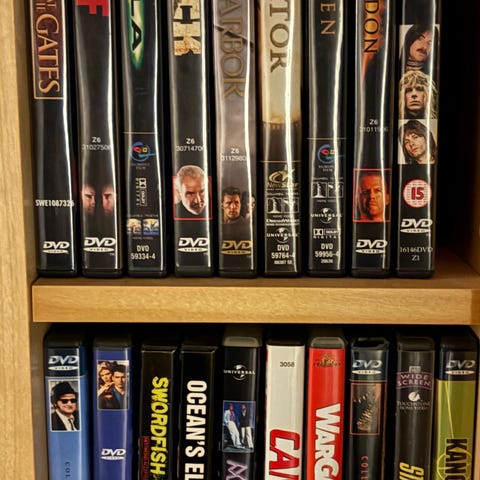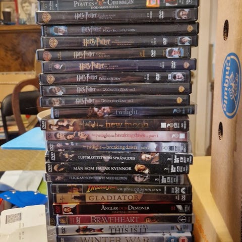 Samling av DVD-filmer inom genrerna action och drama. Innehåller titlar som Ambulance, Black Sea, Kill the Messenger, Southpaw, Den of Thieves, Hell or High Water, Everest, Point of No Return, United States of Tara, Hard Target, American Sniper, Falling Down, Fighting, Iron Man, Safe House, Breaking In, The Hateful Eight, Magnificent Seven, The Survivalist, Heartbreak Ridge, Hostiles, Maleficent, Touch of Nature, Black Dawn, Godzilla, Escobar, Good Work, Spider-Man, Inside Man, Karatellen, Midnight Run, Cold Pursuit, Shaft, Bronco Billy, Rocky Balboa och Fight Night. Filmerna finns i DVD-format och är avsedda för underhållning. Är 60 filmer av 74 ikvar dvd/blueray säljer allt för 700 o skickar med 20 första bond filmer i väska så 80 filmer