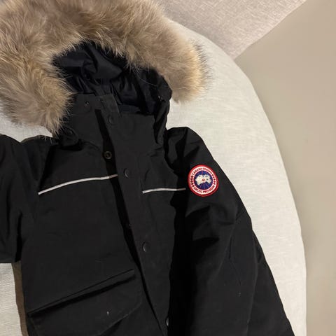 Fin röd Canada Goose jacka i strl XS (dam). Pälsen på kragen är fortfarande fin. Jackan kan behöva en tvätt och har några små skador på höger arm som framgår av bild men är i övrigt i fint skick.