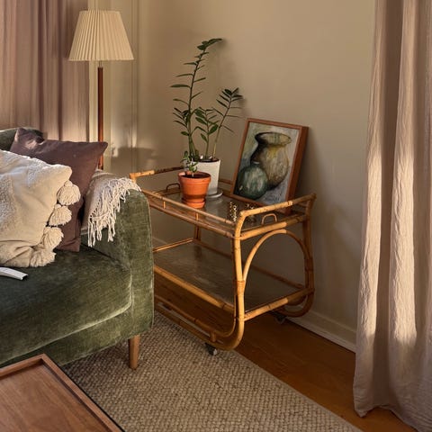 Hjulförsedd serveringsvag i triangulär form i Mahogny med frostad glassskiva. Allt är helt original i gott använt skick.