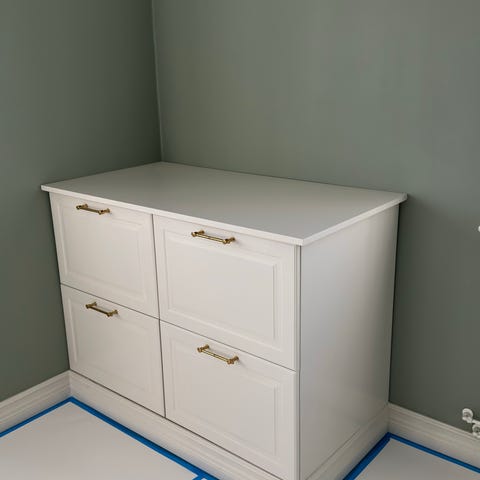 Byråerna är målade med väggfärg från Jotun, denna färg lämpar sig inte riktigt för möbeln då den är känslig för slit. Byrån skulle behöva målas om.