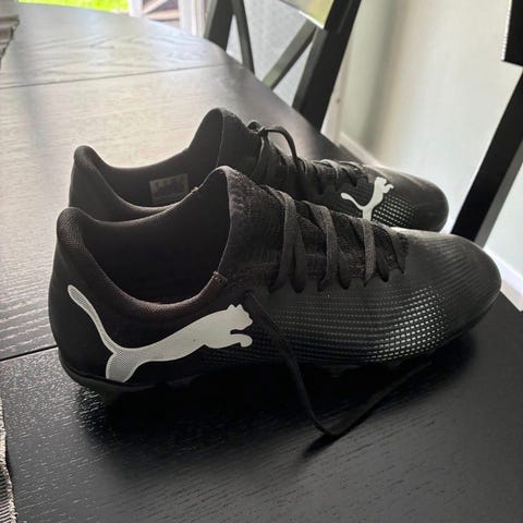 Adidas Predator fotbollsskor och Puma benskydd i svart, storlek 35. Skorna har dobbar för gräsunderlag och benskydden har justerbara remmar för fäste runt benet.