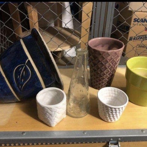 Dags för förrådsrensning och ett gäng krukor ska bort. De finns i varierande färger och former, välanvända men hela.